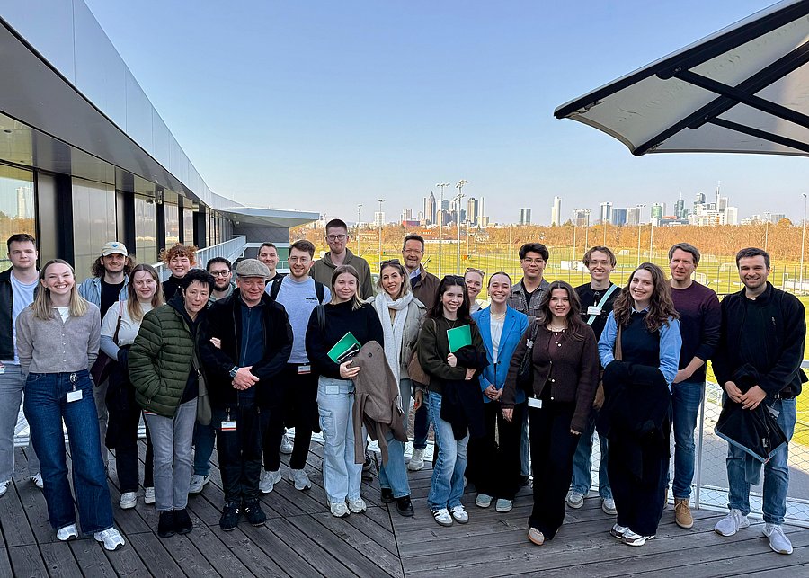 Im Anschluss führte Sophie Kimmerle die Gruppe über den DFB-Campus mit seinen weitläufigen Liegenschaften und zeigte auf, wie Nachhaltigkeit auch operativ-infrastrukturell umgesetzt wird. Diese Kombination aus Fachinput und „Blick hinter die Kulissen“ machte die Exkursion zu einem ganzheitlichen Erlebnis. Bei bestem Wetter konnten die Studierenden zudem vom Dach des Hauptgebäudes aus die Frankfurter Skyline genießen. Ein gelungener Rahmen für einen intensiven und inspirierenden Tag.